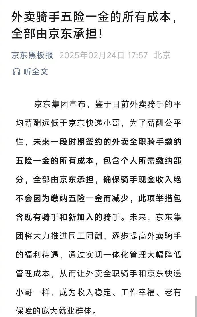 京东这么做,给出的理由是:鉴于目前外卖骑手的平均薪酬远低于京东快递小哥,为了薪酬公平性。所以,在未来一段时期里,与其签约的外卖全职骑手缴纳五险一金的所有成本,包含个人所需缴纳部分,全部由京东承担。